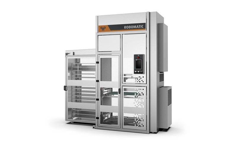 Der Beladeroboter ROBOMATIC übernimmt das Handling von Dielen und Blechen vor Kleingebäckanlagen und Brötchenanlagen.