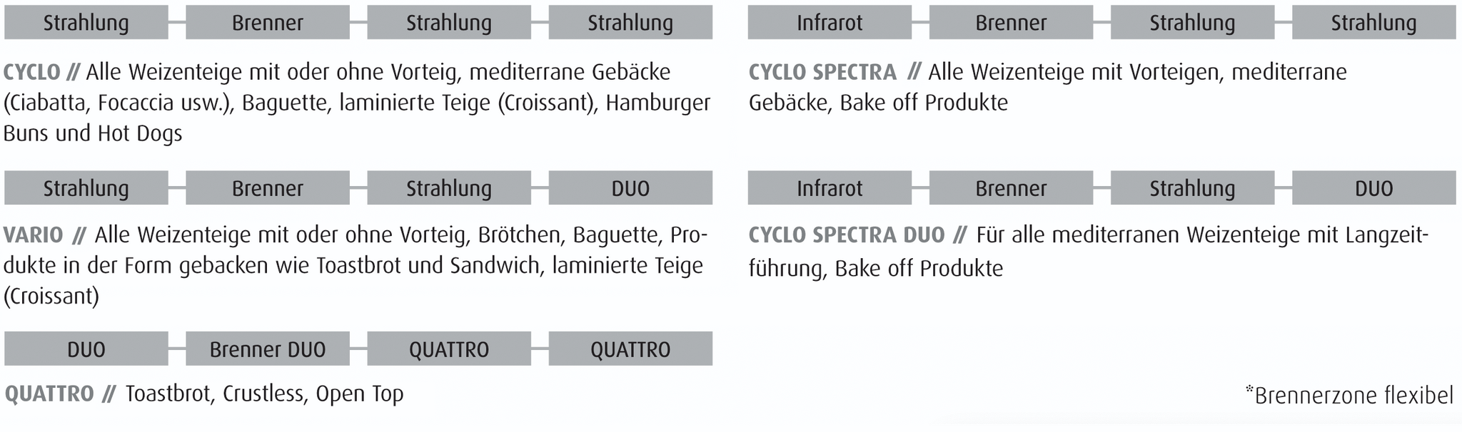 Perfekte Backergebnisse werden aufgrund des geschlossenen ZYKLOTHERM-Heizgasumwälzsystems erzielt. Dabei handelt es sich um eine indirekte Beheizung, d.h., die Heizgase sind vom Backraum getrennt und kommen mit der Backware nicht in Kontakt. Die Wärmeübertragung auf das Gebäck erfolgt über Strahlung, Konvektion und Wärmeleitung. Dabei lässt sich jede Regelzone unabhängig mittels Ober- und Unterhitze regulieren.