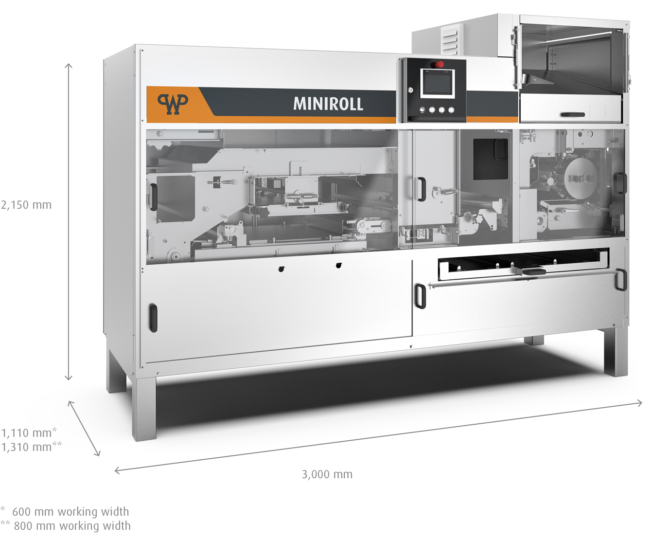 The interchangeable pressure boards and the driven top belt ensure variety. And what’s more: In green mode, up to 9,000 pieces can be produced per hour. Quite maxi, our MINIROLL!