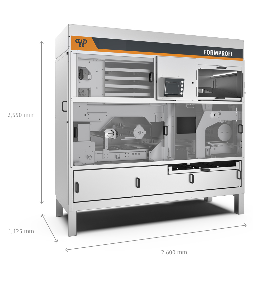With a length of 2.6 m and a height of 2.55 m, the FORMPROFI is extremely compact and fits even into the smallest bakehouse. Therefore, no additional investment in building-specific structural work is required.