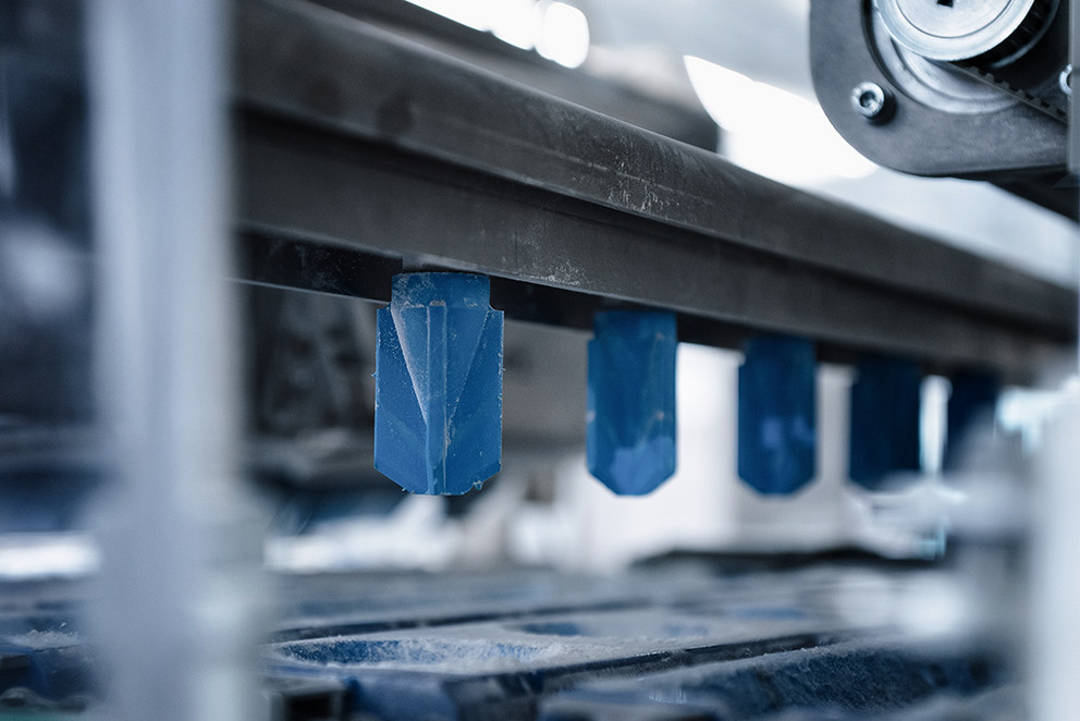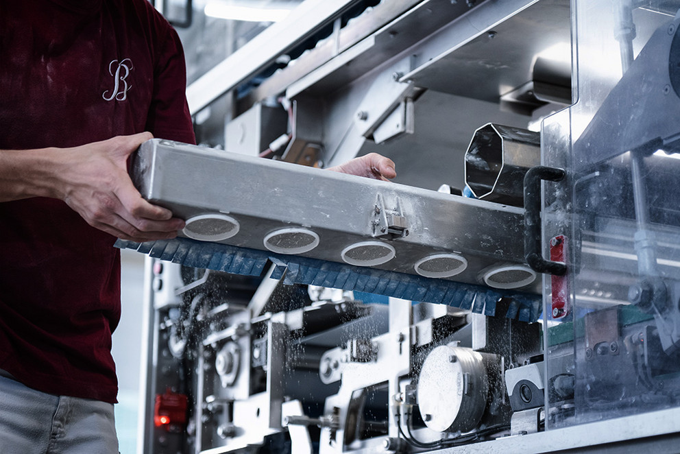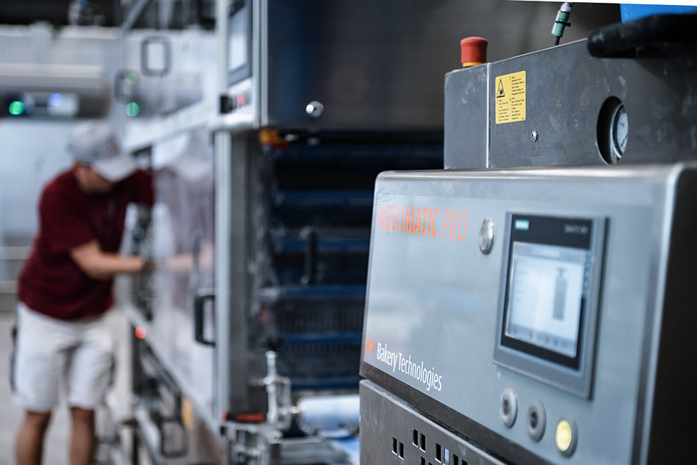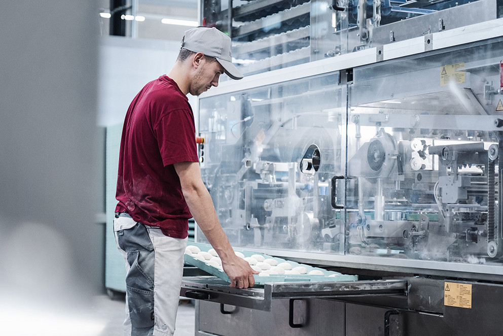 Not only during trial baking in Dinkelsbühl, but also during operation. At peak times, up to 5,200 Schlossweck bread rolls per hour are produced on the line. The Wachau station works flour into the dough pieces particularly gently and carefully. Production is now handled by only one employee instead of two. The round, floured rolls are stored deep-frozen on boards and, like the second bestseller, Kaiser rolls, are actually baked in the branch stores. Burkard Bakery operates 11 of its 14 locations beyond supermarkets’ checkout areas, from Schlüsselfeld in the west to Hirschaid in the east and from Bamberg in the north to Röttenbach in the south.